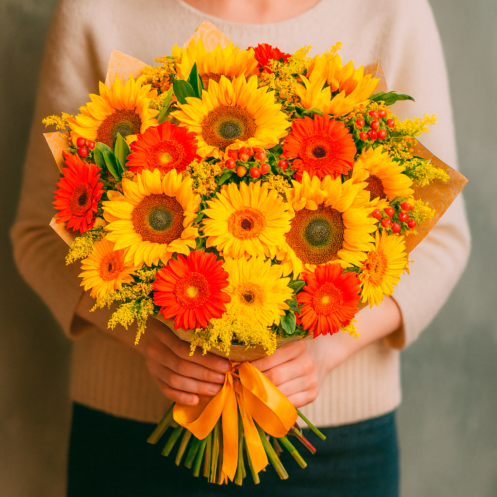 Букет «Солнце» — восхитительная композиция цветов, в которой каждый компонент органично взаимодействует с остальными. В цветочной композиции все элементы проработаны, а цветовая гармония создает уникальный стиль.