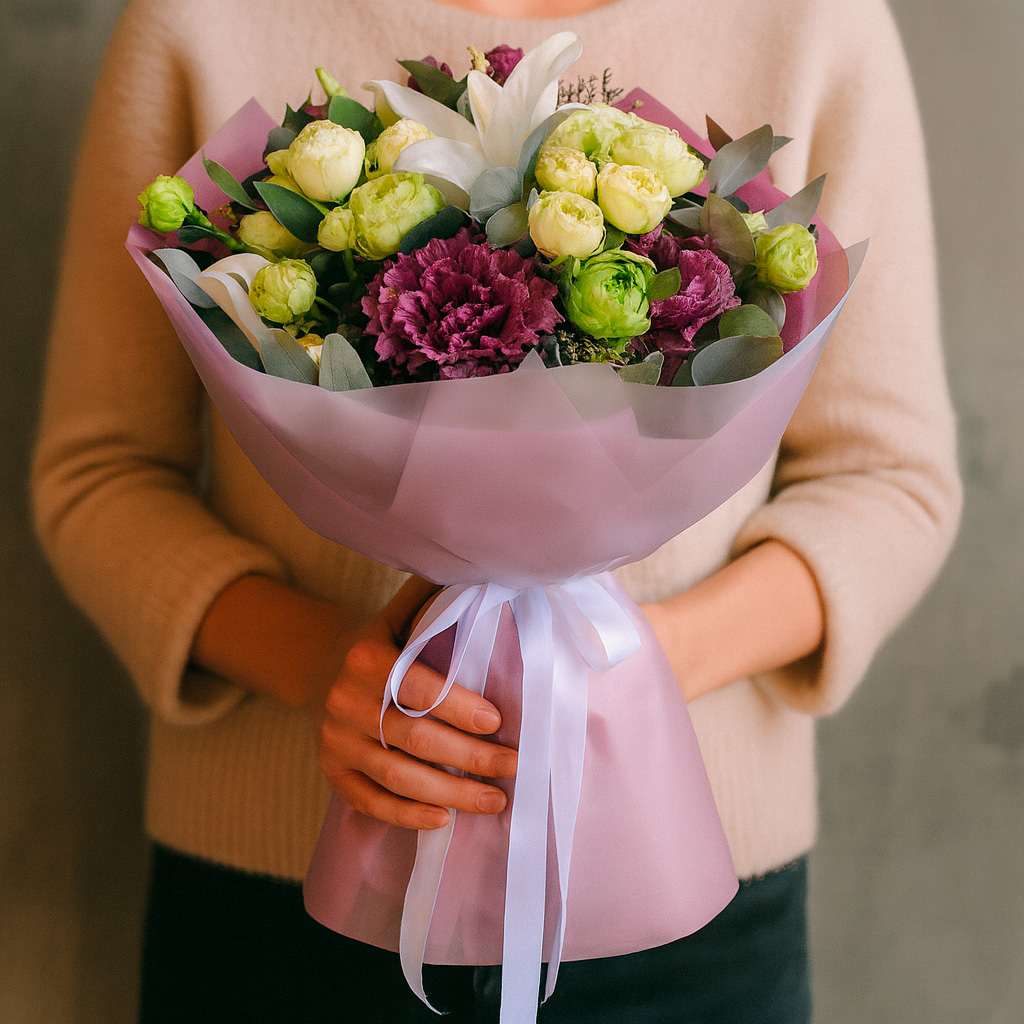 Пышный букет с брассикой, кустовой пионовидной розой, зелёной эустомой, белой лилией и эвкалиптом создаёт атмосферу нежности и изысканности. Упакован в матовую плёнку пастельных тонов и перевязан атласной лентой. Возможны альтернативы оформления с использованием крафт-бумаги или декоративной сетки. Прекрасный выбор на годовщину для любимой.