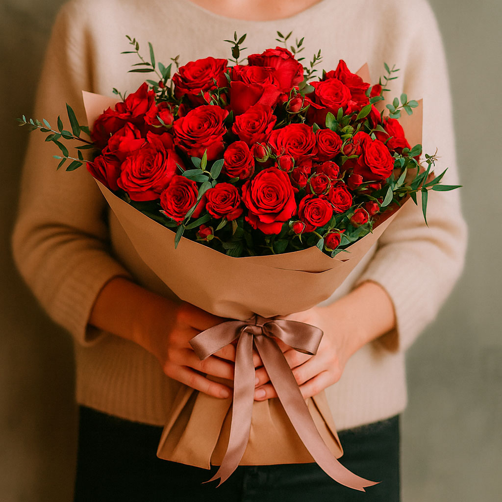 Роскошные красные кенийские розы в сочетании с нежным эвкалиптом создают яркий и запоминающийся букет. Упакован в крафт-бумагу и перевязан атласной лентой, он выглядит стильно и элегантно. Возможны альтернативы: матовая плёнка или декоративная сетка. Прекрасный выбор для любимой на годовщину или свадьбу.