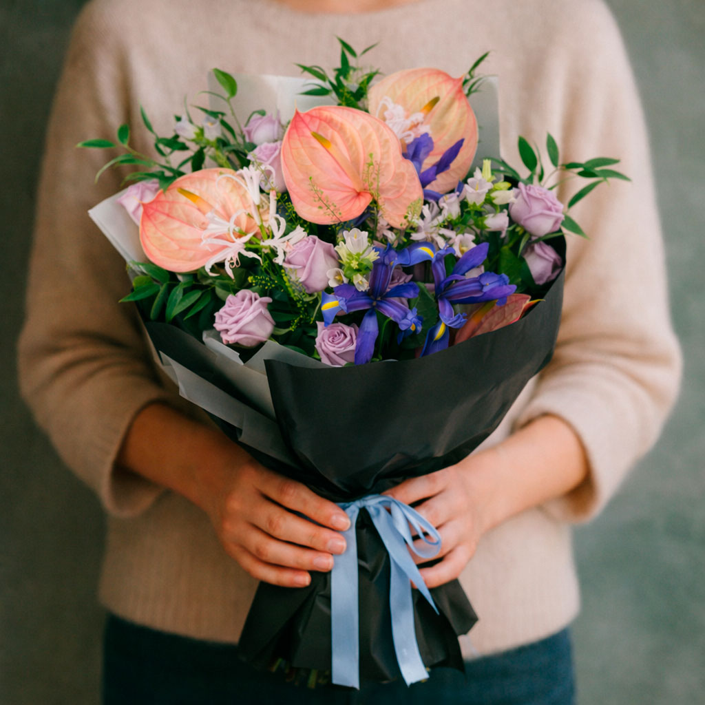 Роскошный букет из розового антуриума, бледно-фиолетовой кустовой розы, фиолетового ириса и белого колокольчика, дополненный зеленью, создаёт атмосферу нежности и элегантности. Упакован в матовую плёнку с чёрной и белой гаммой, перевязан голубой лентой. Возможны альтернативы оформления: атласная лента или крафт-бумага. Прекрасный выбор для подарка на годовщину или для любимой.