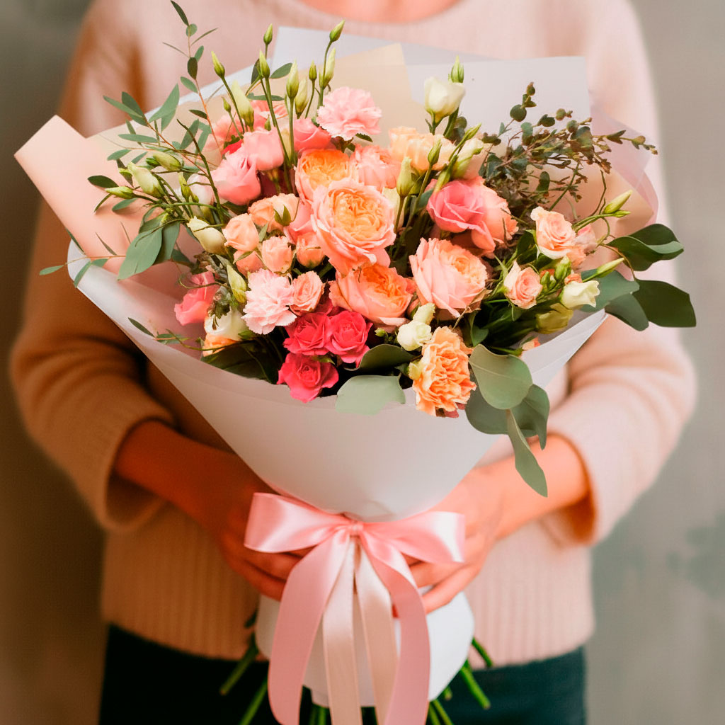 Розовые кустовые розы и белая эустома создают нежное сочетание, дополненное кремовой гвоздикой и свежим эвкалиптом. Букет оформлен в матовую плёнку с атласной лентой, что придаёт ему изысканность. Возможны альтернативы упаковки: крафт-бумага или декоративная сетка. Прекрасный выбор для любимой на день рождения.