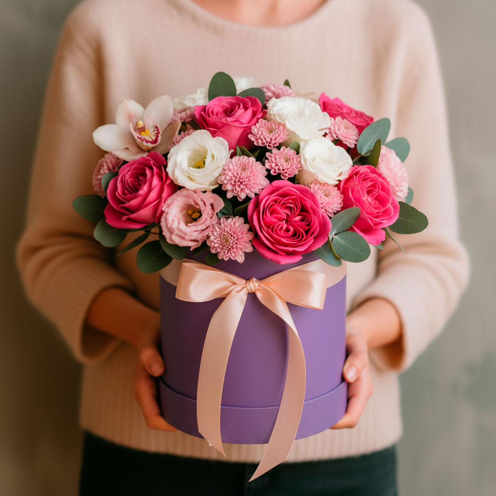 Розовые пионовидные розы, белые и розовые эустомы, красные кустовые розы, розовые орхидеи и нежно-розовые хризантемы создают гармоничную композицию. Цветы оформлены в стильной фиолетовой шляпной коробке, добавляя элегантности. Возможны варианты оформления в бархатной или атласной коробке. Идеально для подарка на день рождения для любимой.