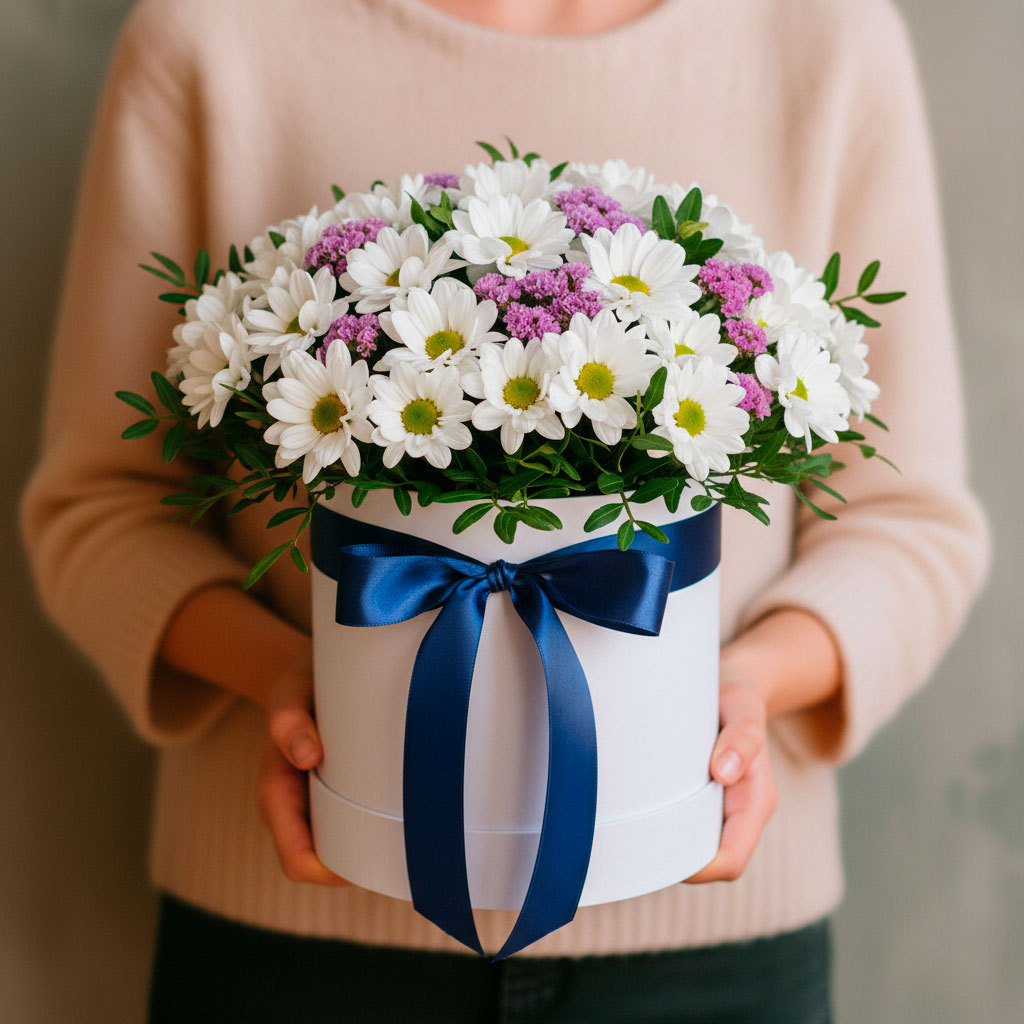 Белоснежные кустовые хризантемы в сочетании с розовой и фиолетовой статицей создают нежную и воздушную композицию. Шляпная коробка белого цвета украшена яркой синей лентой, подчеркивающей изысканность букета. Возможны варианты оформления в бархатной или атласной коробке. Прекрасный выбор для подарка на годовщину или для любимой.
