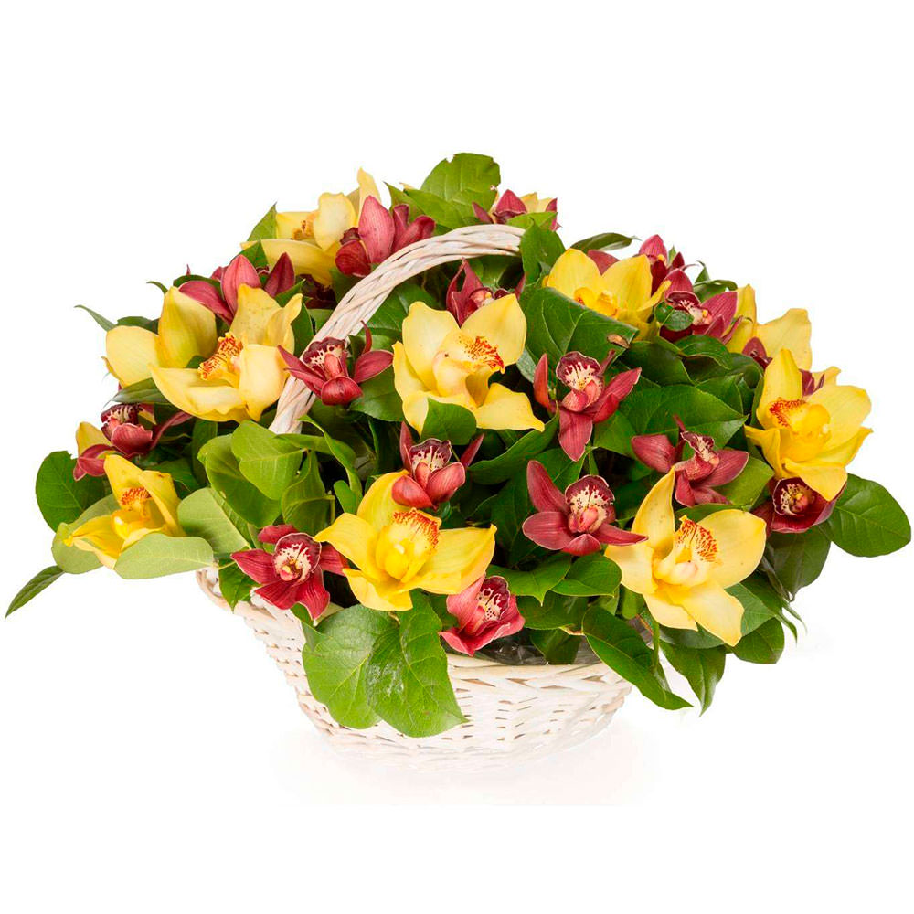 Яркие орхидеи микс в жёлтых и красных тонах создают живописную композицию, дополненную свежей зеленью. Корзина из белого плетения подчёркивает изысканность цветов. Возможны альтернативы оформления: корзина из лозы или с тканевой отделкой. Прекрасный подарок для любимой на годовщину или для мамы на День матери.