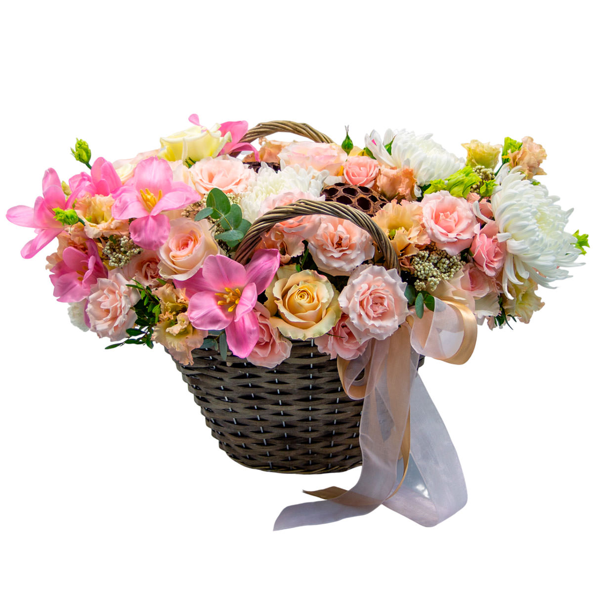 Корзина с живыми цветами включает в себя яркие кустовые розы, нежные эустомы, розовые тюльпаны и белоснежные хризантемы, дополненные экзотическим лотосом. Плетёная корзина украшена изящной лентой, создавая атмосферу лёгкости и изысканности. Возможны альтернативы оформления: корзина из лозы или корзина с тканевой отделкой. Прекрасный выбор для подарка на годовщину или для любимой.