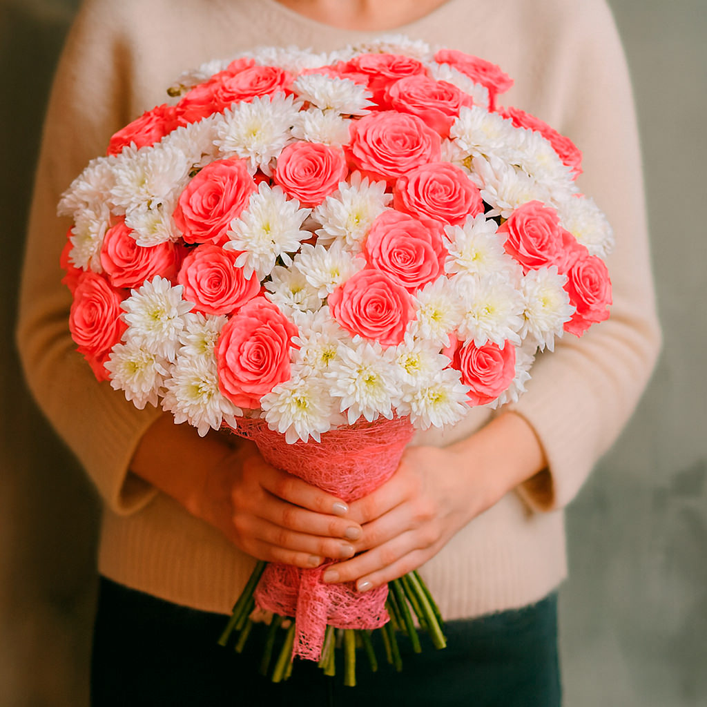 Розовые одноголовые розы и белые кустовые хризантемы создают нежное сочетание, которое очарует любого. Букет перевязан розовой лентой и оформлен в матовую плёнку, добавляя элегантности. Возможны альтернативы оформления: крафт-бумага или декоративная сетка. Прекрасный выбор для подарка на день рождения для любимой.