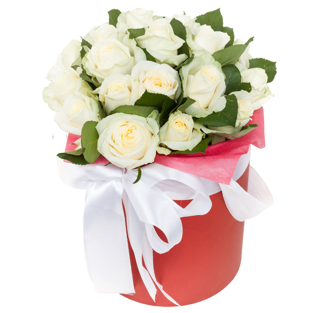 Белые розы, собранные в элегантную композицию, создают атмосферу нежности и утончённости. Они аккуратно размещены в красной шляпной коробке, украшенной белой атласной лентой. Альтернативные варианты оформления: бархатная коробка или коробка с принтом. Прекрасный подарок для любимой на годовщину или день рождения.