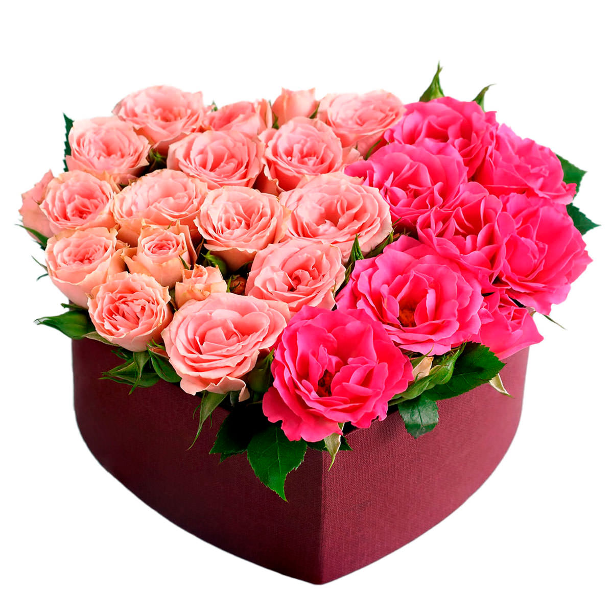 Эта изысканная композиция из розовых и светло-розовых роз создаёт атмосферу нежности и романтики. Цветы расположены в элегантной коробке в форме сердца, подчёркивая их утончённость. Для более оригинального оформления можно выбрать бархатную или атласную коробку. Прекрасный подарок для любимой на 14 февраля или годовщину.