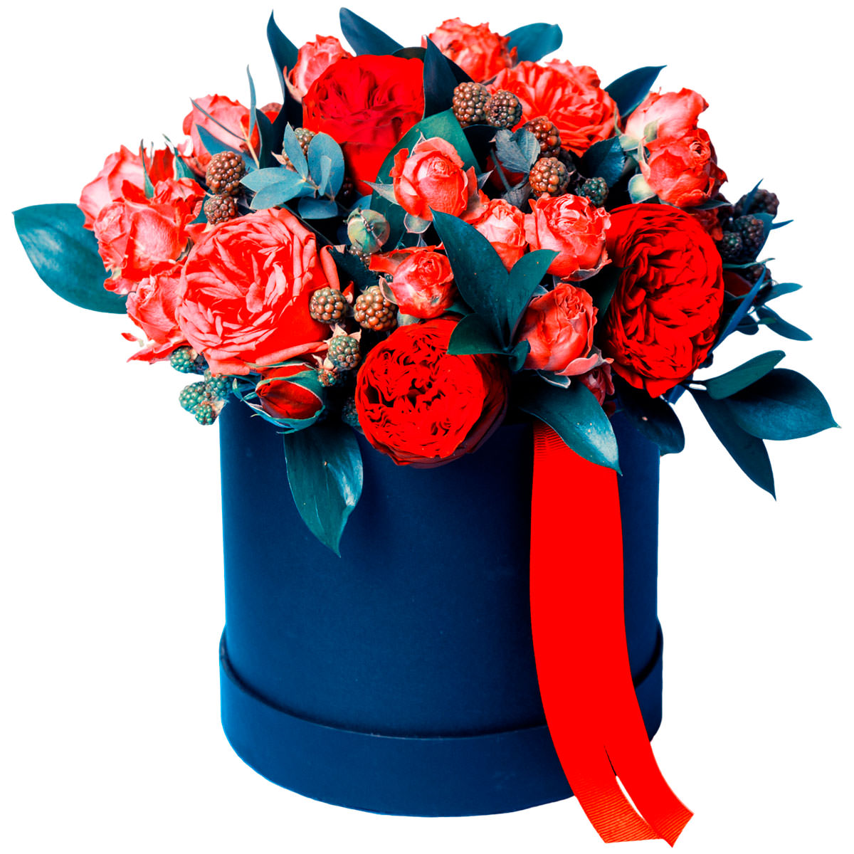 Роскошная композиция из пионовидных и кустовых красных роз, дополненная аспидистрой и ягодами ежевики, создает атмосферу страсти и элегантности. Цветы оформлены в стильной шляпной коробке глубокого синего цвета с яркой красной лентой. Возможны варианты оформления в бархатной или атласной коробке. Идеально для подарка на годовщину или для любимой.
